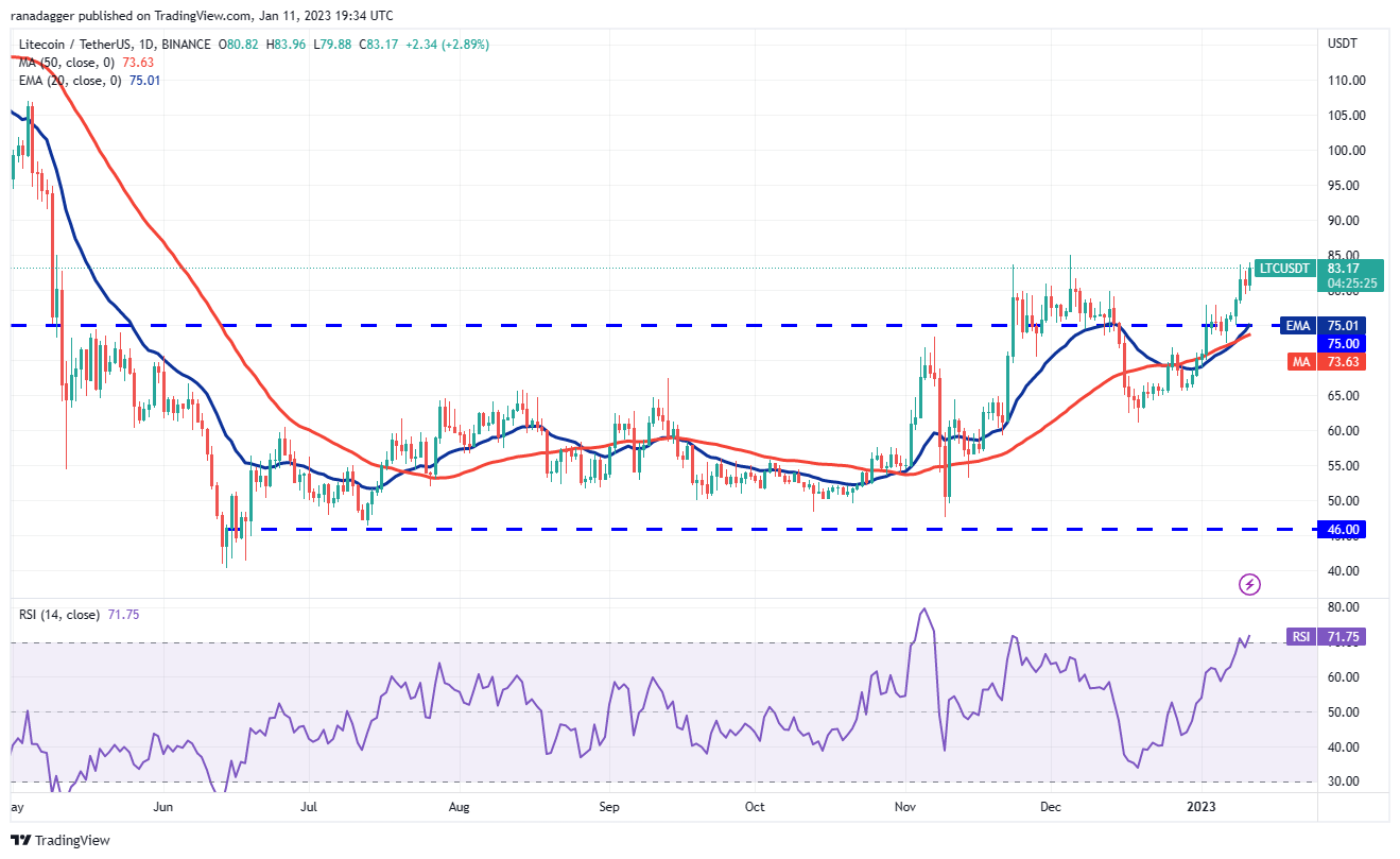 Both moving averages are sloping up and the RSI is in the overbought territory, indicating that bulls are in command. If buyers thrust the price above $85, the LTC/USDT pair could pick up momentum and rally toward the psychologically important level of $100.