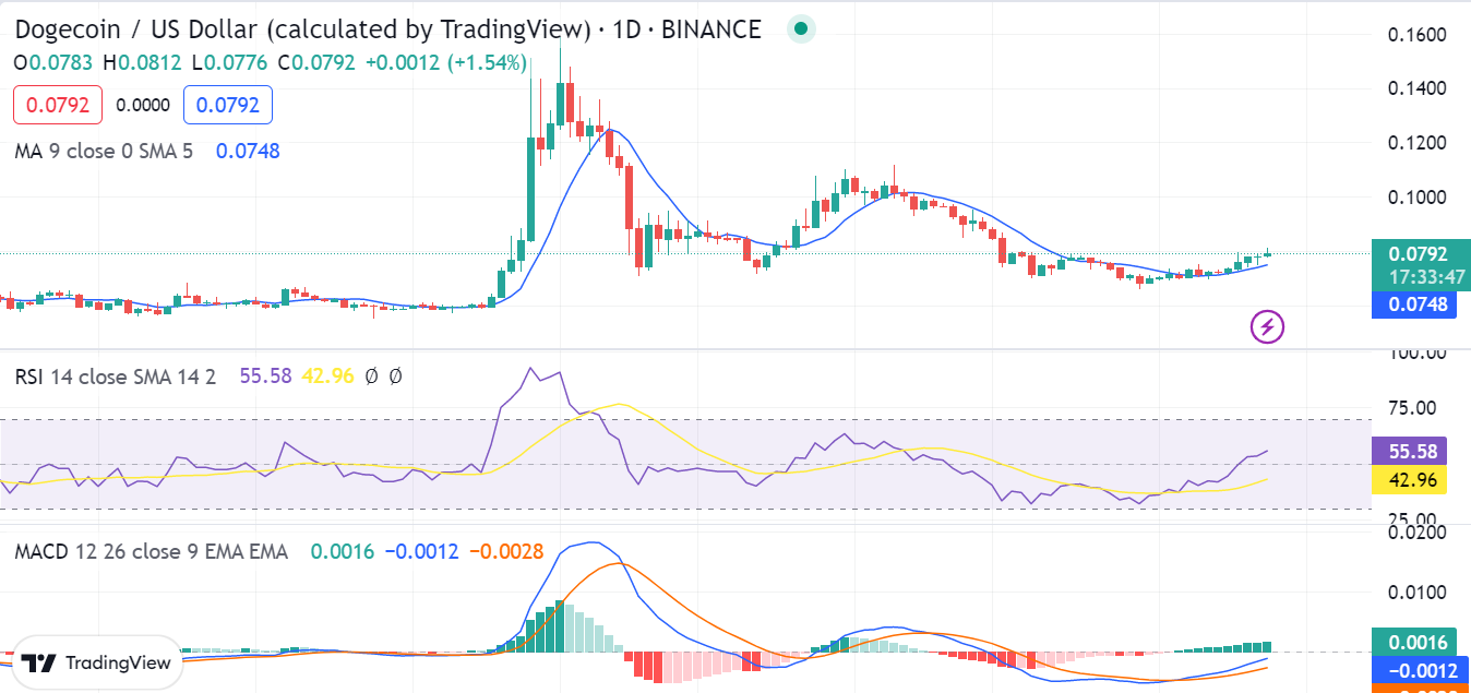 Dogecoin is bullish, with DOGE/USD pair rising to the $0.07912 level after increasing by more than 2.18% over the last 24 hours. However, the digital asset is facing some resistance at $0.08072. Traders are expecting the token to break through this level and continue its uptrend. The price action recently created a bullish engulfing candlestick pattern on the daily chart, signaling a potential breakout.