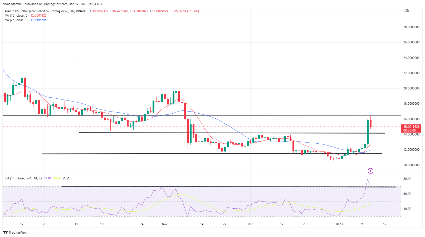 AVAX/USD moved to a peak of $16.11 earlier in the day, which comes less than 24 hours after falling to a bottom of $12.41.