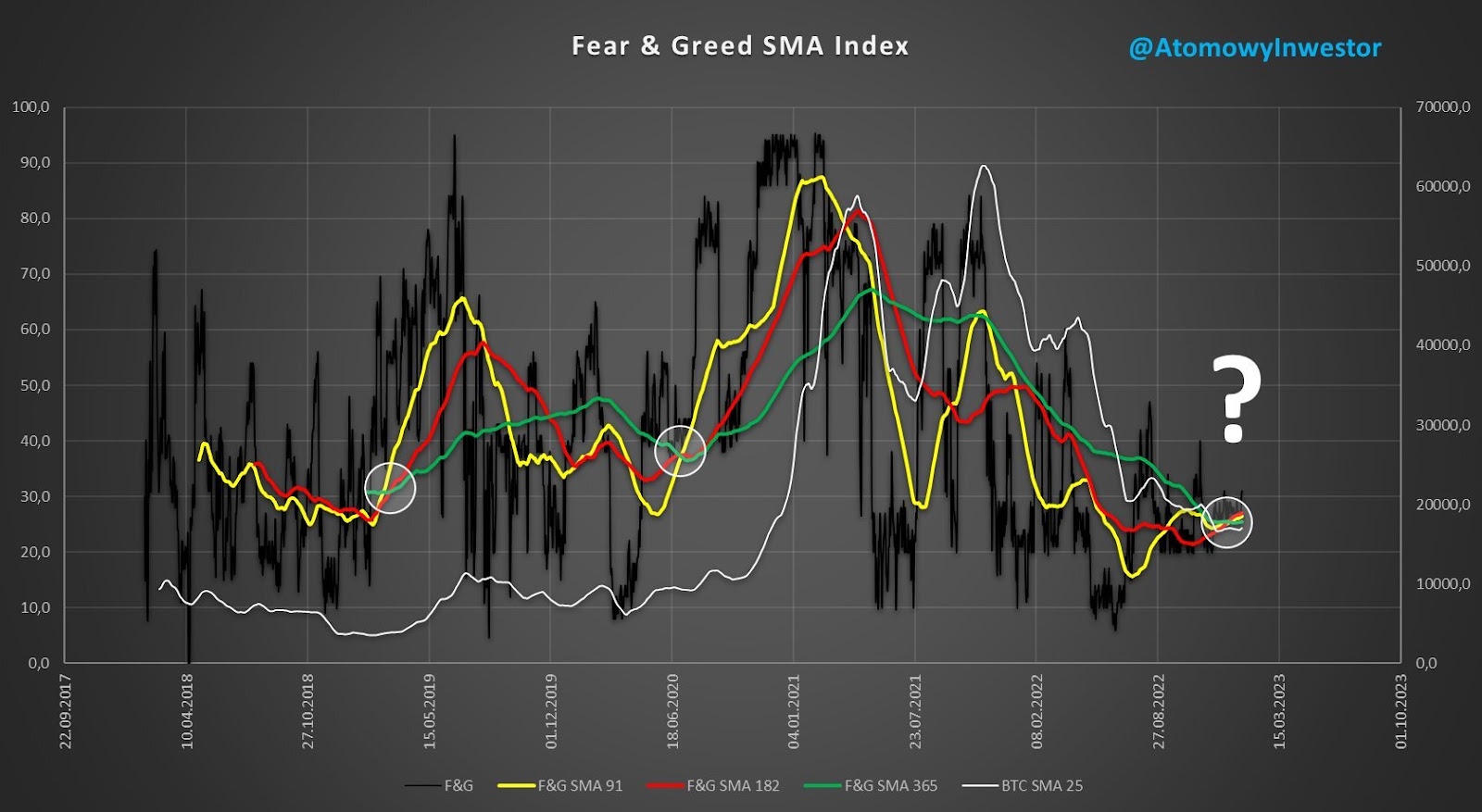 Cryptocurrency investor and market analyst @AtomowyInvestor has tweeted an update to his moving averages (SMA) chart of the Fear and Greed Index. He takes into account 3 curves: quarterly (91D SMA, yellow), semi-annual (182D SMA, red) and annual (365D SMA, green).