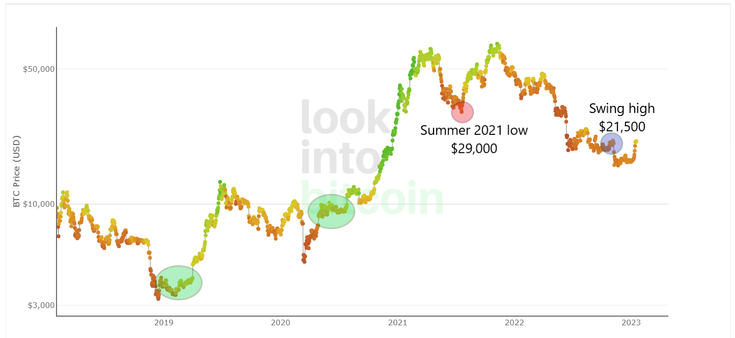 Secondly, the index is giving neutral readings today for the first time since the collapse of the macrostructure of the previous bull market. The May drop of Bitcoin price below the summer 2021 low at $29,000 (red circle) confirmed a long-term bearish trend reversal. Now there is a chance for an opposite signal. This will happen if the BTC price manages to break out above the November “swing high” at $21,500 (blue circle).