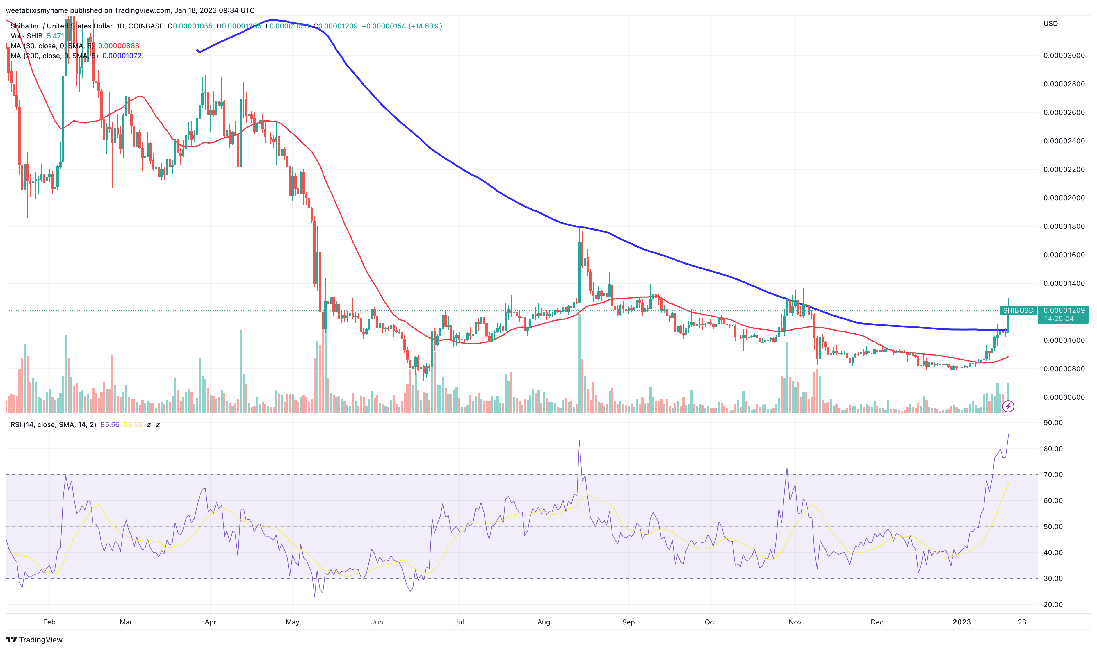 SHIB's chart seems to suggest that the altcoin has gone more or less parabolic, with its relative strength index (purple) about to reach 90. Likewise, its 30-day moving average (red) has turned upwards and is likely to overtake its 200-day average, signalling a breakout to a new longer term level.