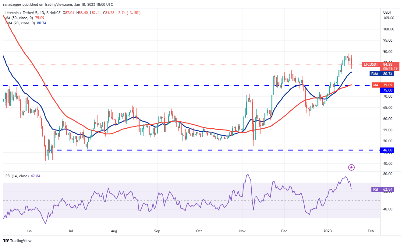 Litecoin’s ($LTC) up-move faltered near $91 on Jan. 14 and the bears pulled the price back to the 20-day EMA ($80) on Jan. 18. Buyers are trying to protect the level as seen from the long tail on the day’s candlestick.