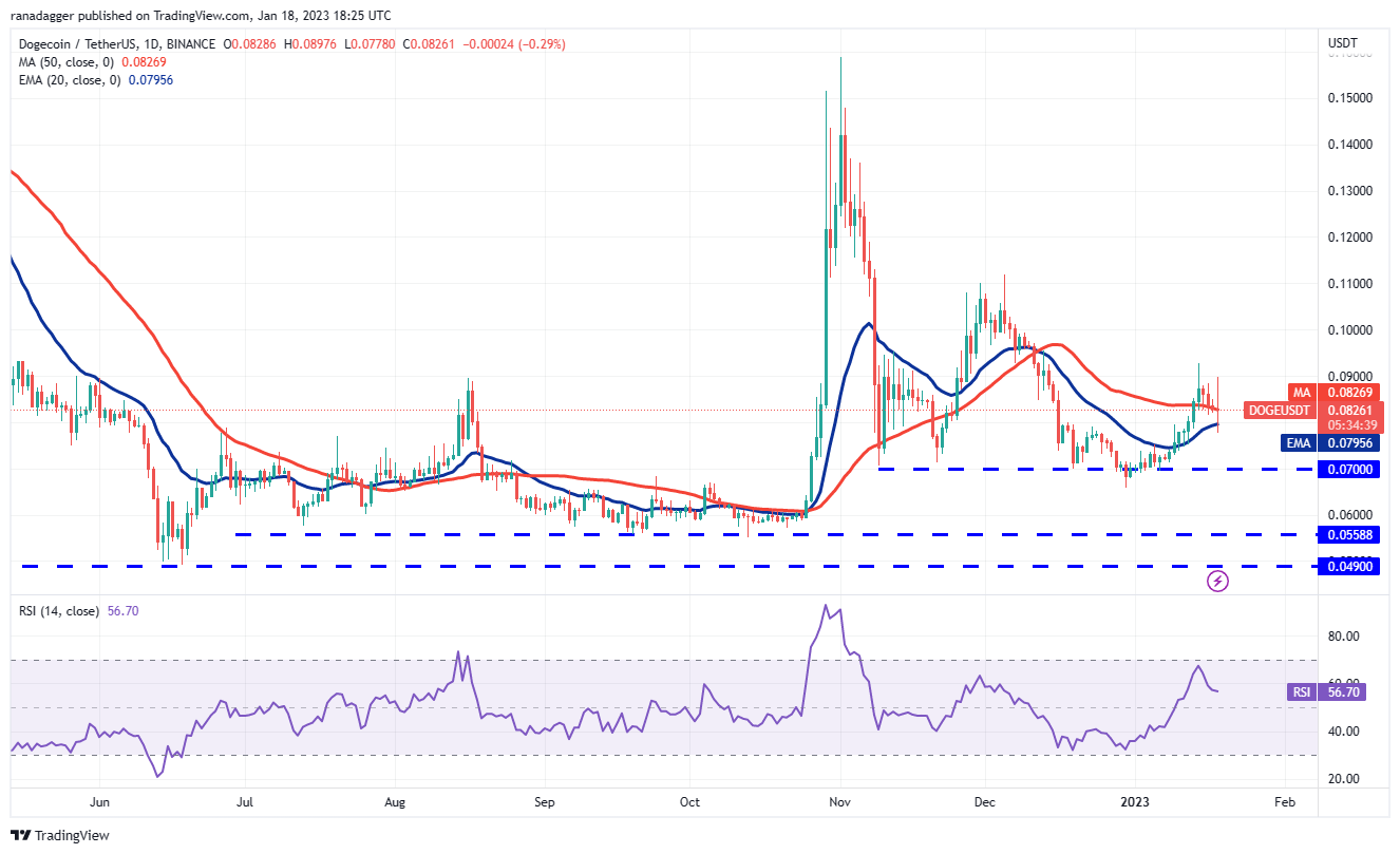 The bears pulled the price below the moving averages on Jan. 18 but have failed to sustain the lower levels. The gradually rising 20-day EMA ($0.08) and the RSI in the positive zone indicate that bulls have a slight edge. Buyers will try to kick the price above $0.09 and start the northward march toward $0.11.