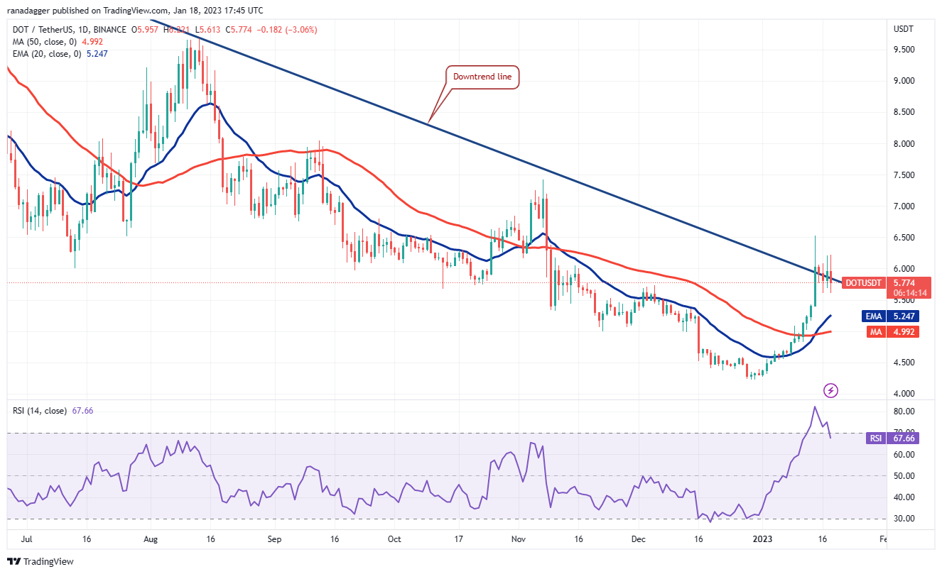 The 20-day EMA ($5.24) has started to turn up and the RSI is near the overbought territory indicating the path of least resistance is to the upside. If buyers drive the price above $6.53, the $DOT/$USDT pair could pick up momentum and travel to $7.42 and thereafter to $8.05.