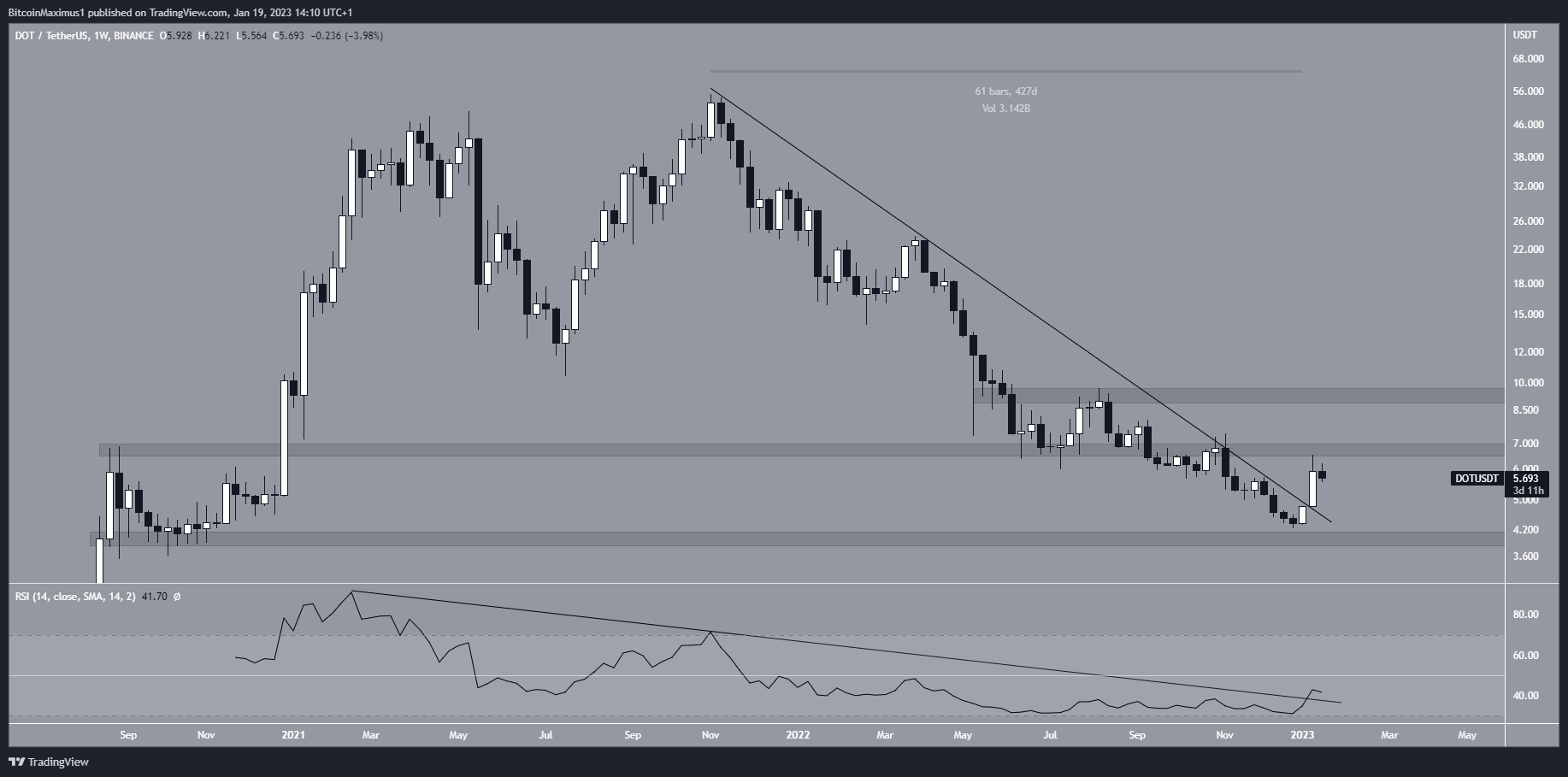The Polkadot price had fallen under a descending resistance line since its all-time high of $55.10 in Nov. 2021. The decrease led to a minimum price of $4.22 in Dec. 2022. The descending resistance line stayed intact throughout this entire downward movement.