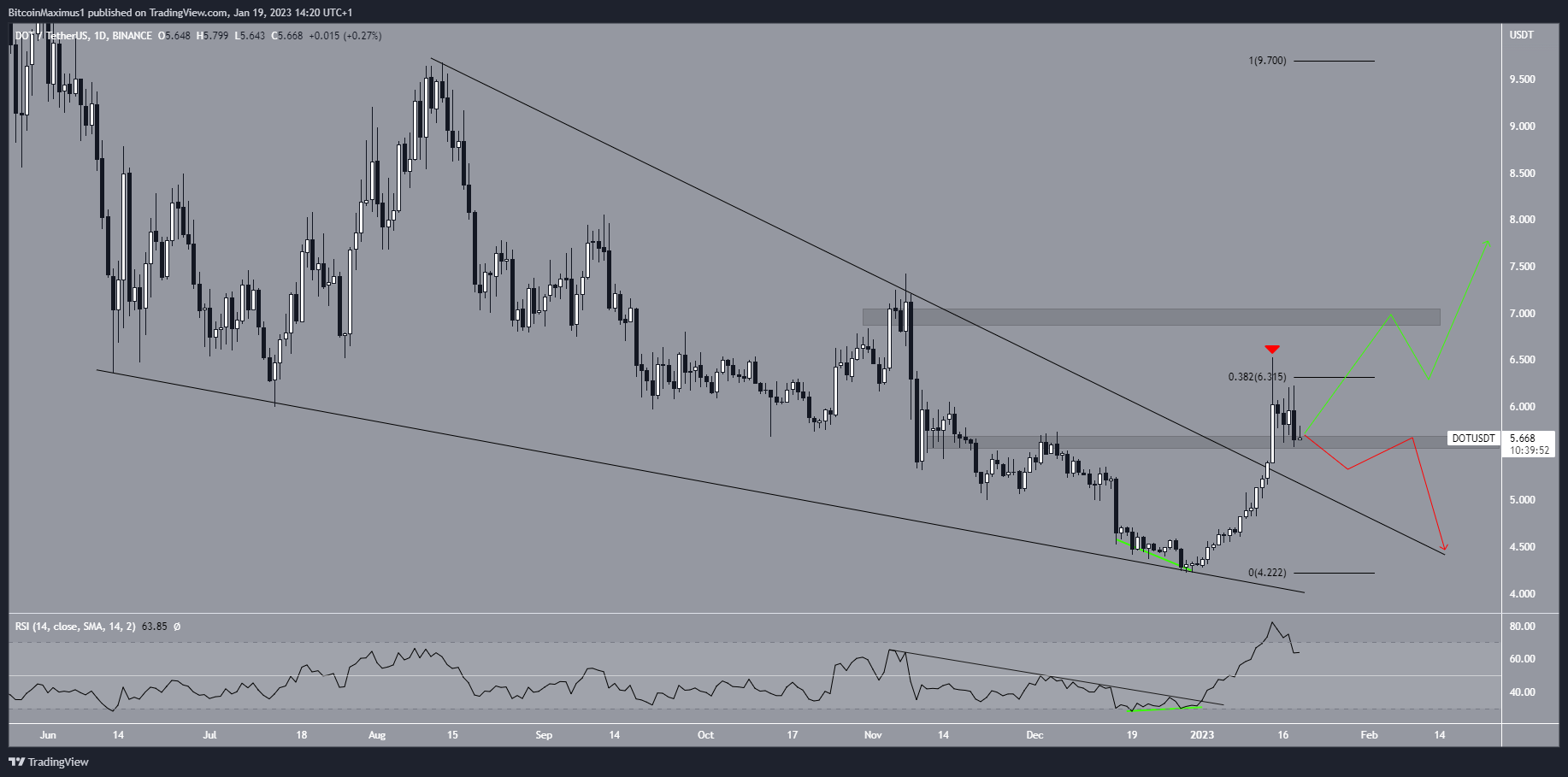 However, the Polkadot price began 2023 with an upward movement which caused a breakout from the resistance line. At the time of the breakout, the line had been in place for 427 days. Breakout from such long-term structures often lead to significant upward movements and insinuate that the preceding downward trend has ended.