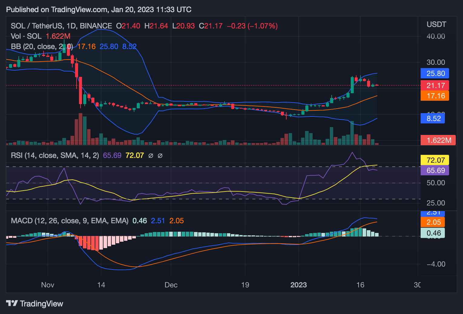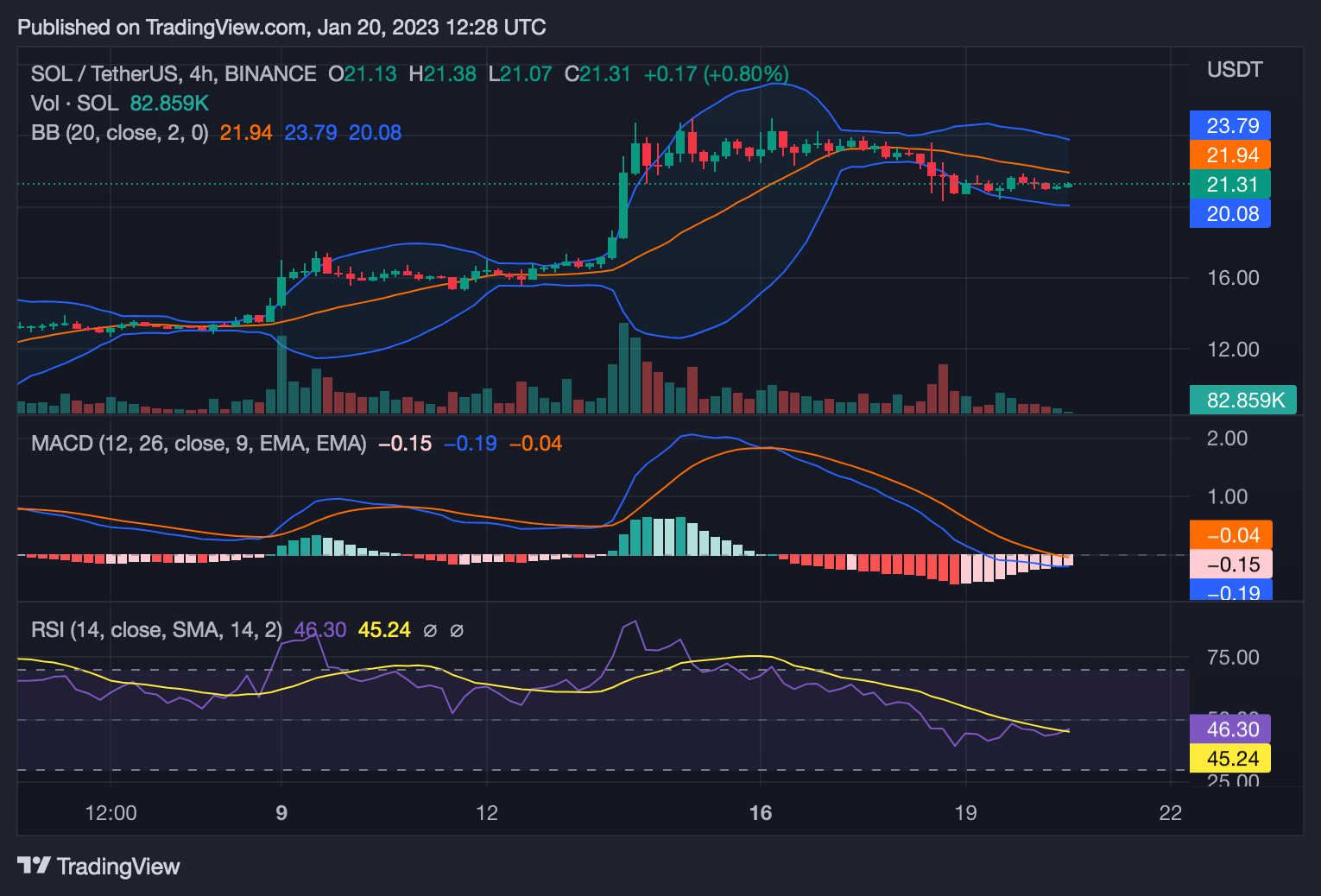 According to Solana, the SOL/USD crypto pair is now moving upwards as a whole. The currency is currently trading at $21.33 with the bulls controlling the market sentiment across all time periods as a result of technical indicators working in their favor. The value of the currency has slightly grown.