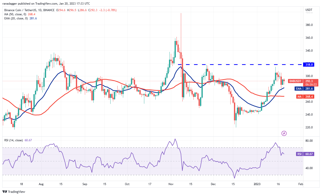 BNB (BNB) bounced off the 20-day EMA ($281) on Jan. 19 but the bulls are struggling to sustain the momentum as higher levels are attracting sellers.