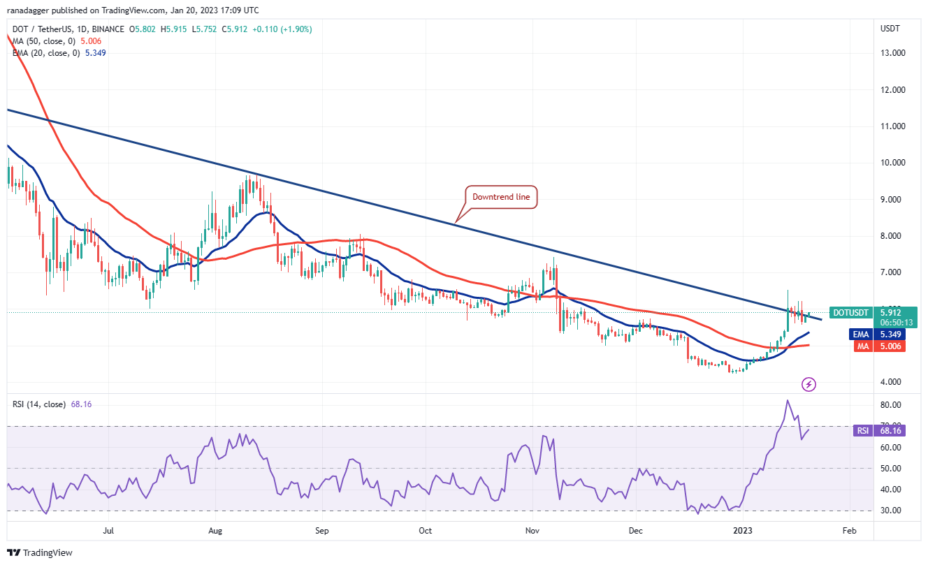 That is what happened with the MATIC/USDT pair which turned down from the overhead resistance at $1.05. The first line of support is at the 20-day EMA ($0.90). Buyers held this level on Jan. 19 but they will need to propel the price above $1.05 to start a new up-move.