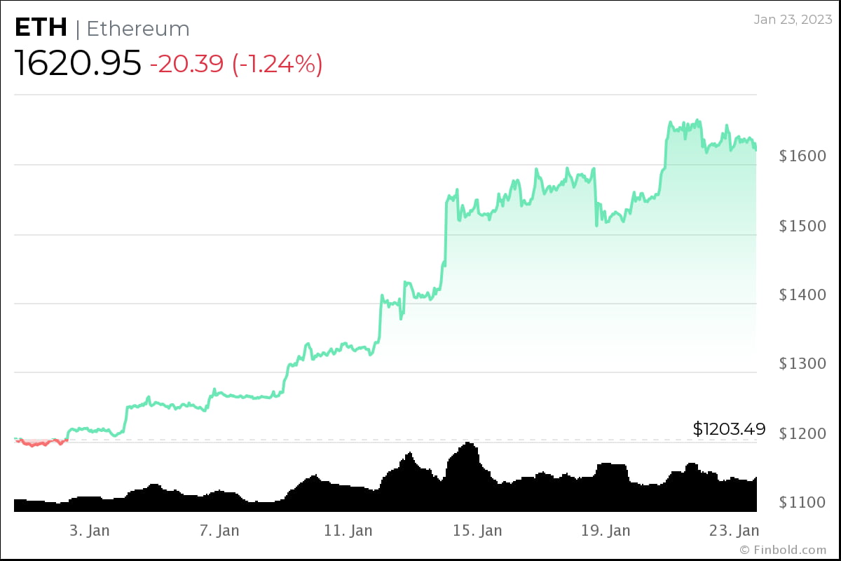 Ethereum ($ETH), is now trading in the green above $1,600 after a solid start to 2023 after beginning the year at $1,197.