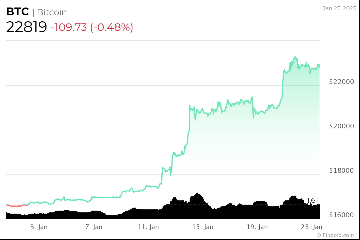 Bitcoin ($BTC) has climbed from $16,500 on January 1 to briefly above $23,000 in January. At the time of publication, the flagship digital asset was trading at $22,882, up 9.78% across the last week.