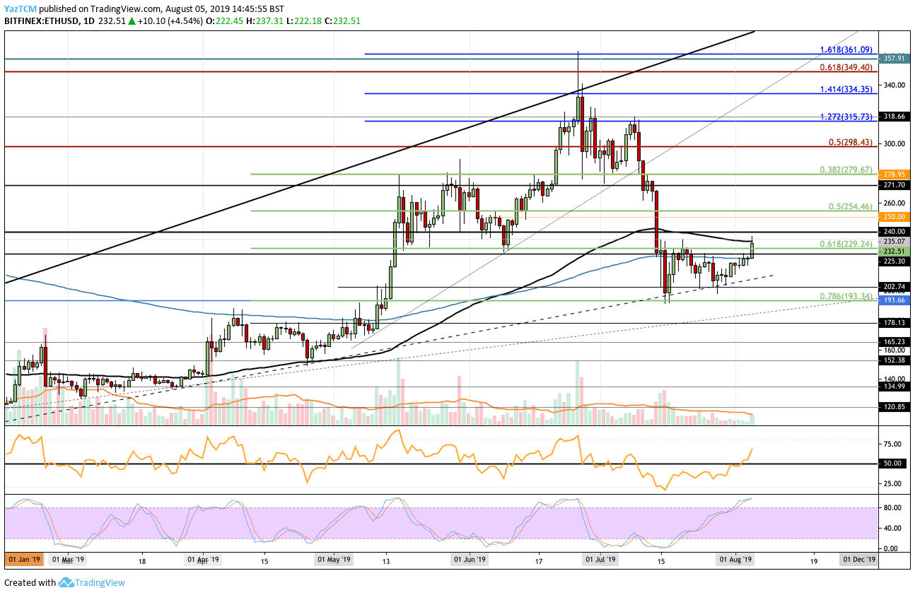 - Since our previous ETH/USD analysis, we can see that Ethereum managed to break above the $220 and $230 resistance areas, and has now met higher resistance at the 100 days EMA around $235 as expected.