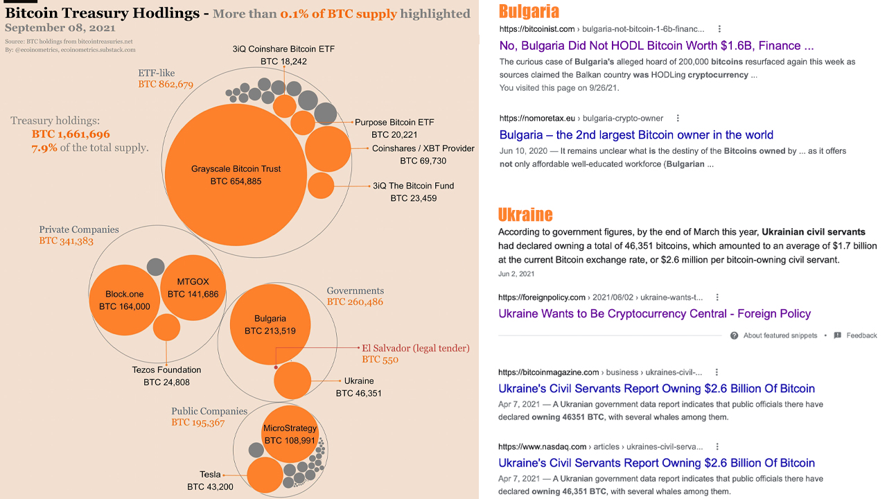 Evidence shows it is very likely that Bulgaria auctioned the 200K BTC stash, yet some still believe it is owned by the Bulgarian government. It is also assumed that the government in Ukraine owns 46,351 bitcoin but that figure only comes from public disclosure forms that derive from Ukrainian civil servants.