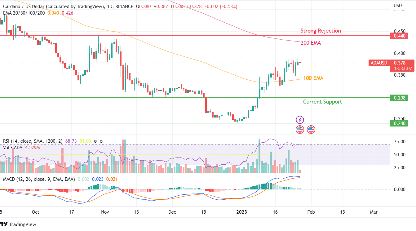 ADA price action has reached the new peak valuation of $0.38, which brings the token close to its previous strong resistance of November 2022 at $0.44. The technical outlook of ADA has taken a positive turn since 2023 began a positive movement for cryptocurrencies. ADA has thus reclaimed its market capitalization of $13 billion.