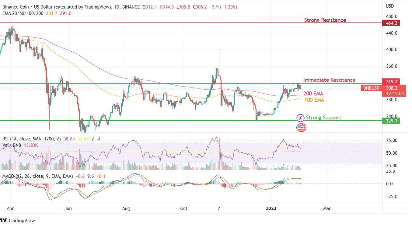Candlesticks tell a story no physical description can ever provide. Here a resistance can be seen developing near the $319 range since the first significant decline of BNB in April 2022. The buying sentiment from its lows helped prices consolidate near $300, but profit booking was a consistent attribute of this price band.