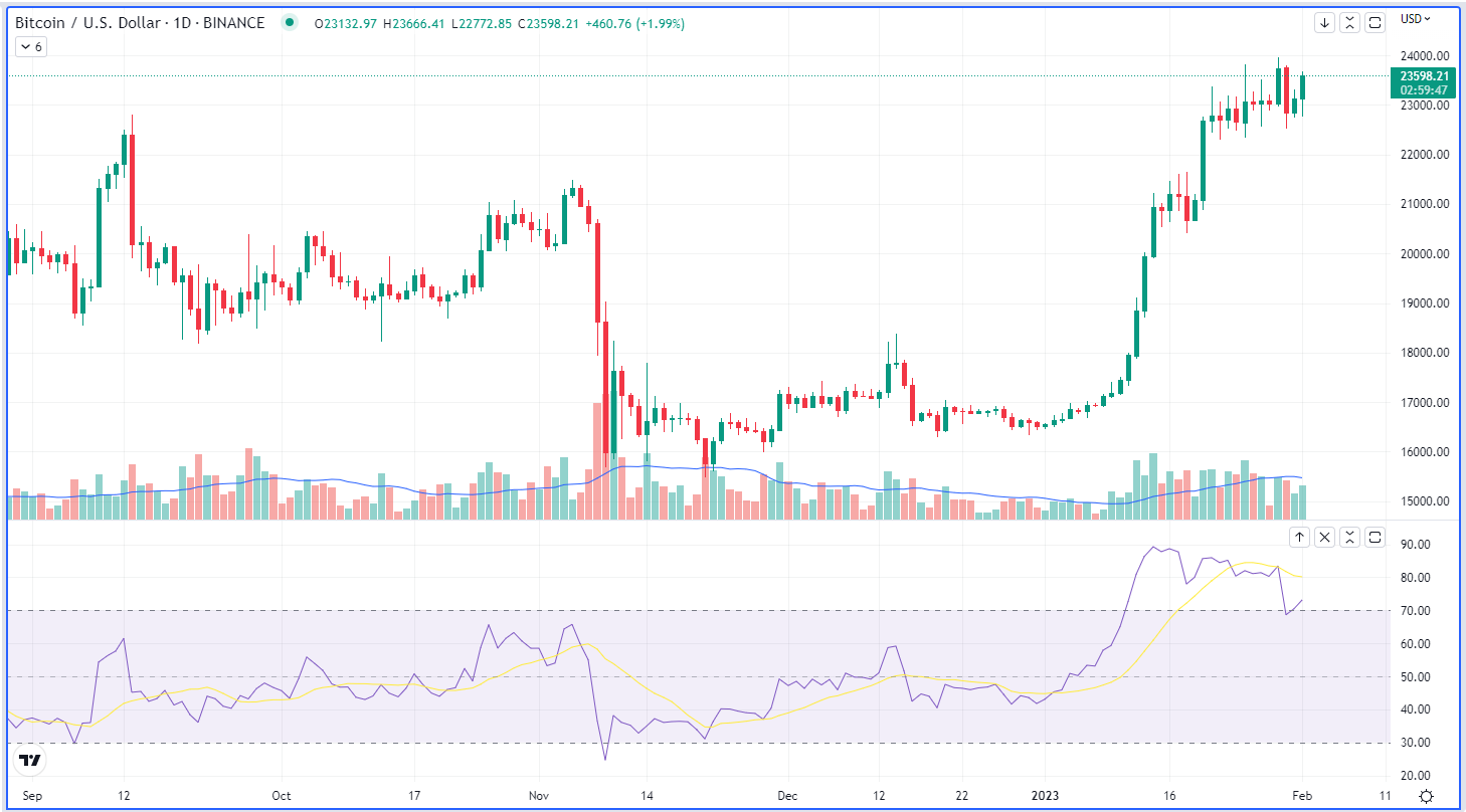 BTC’s price range has narrowed over the last 10 trading days, holding onto its nearly 40% move higher earlier in January. While bitcoin’s price has increased more than 3% over the past eight days, its Relative Strength Index (RSI) has decreased 15% over the same time period. This trend is often referred to as a bearish divergence and can be a precursor to price declines.