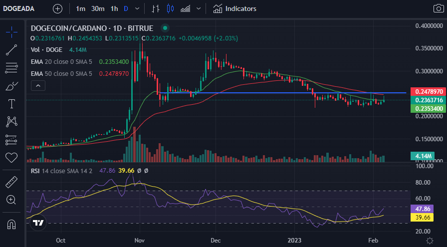 Looking at the daily chart for DOGE/ADA, DOGE has been attempting to make a move on ADA for the last week. All of these attempts failed, however, as ADA’s price was able to hold its own. There is still a chance for DOGE to gain on ADA as the DOGE/ADA pair is currently trading above the 20-day EMA line.