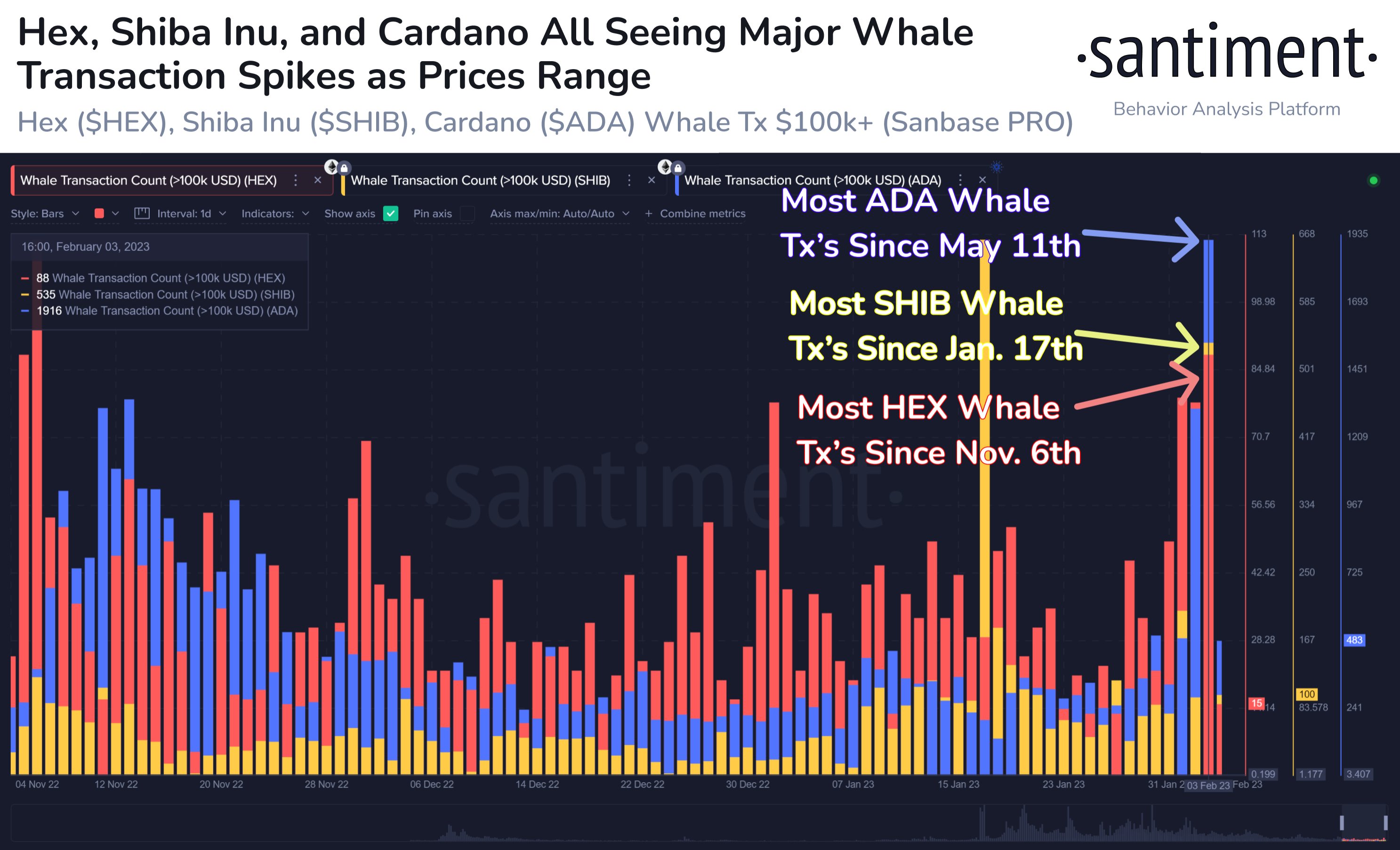 The popular memecoin Shiba Inu (SHIB) and the smart contract platform Cardano (ADA) are seeing major spikes in large whale transactions, according to the crypto analytics firm Santiment.