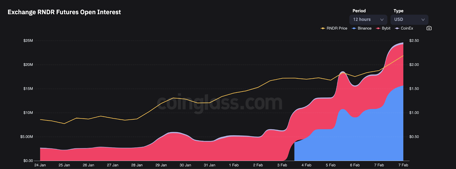 Coinglass data shows that speculative RNDR derivative trades, tracked across top exchanges like Binance, Bybit, and CoinEX, have increased by a staggering 500% since Feb.1. This bullish signal shows how RNDR is attracting new demand at a rate currently higher than its price growth.