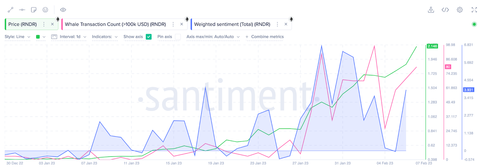 On-chain data from Santiment shows investors are firmly primed for another positive RNDR performance in Feb. Whale activity, denoted by the daily volume of transactions above $100,000, has been on a sustained increase since Jan 7. Within the same period, positive values of daily weighted sentiment have also been on the rise.