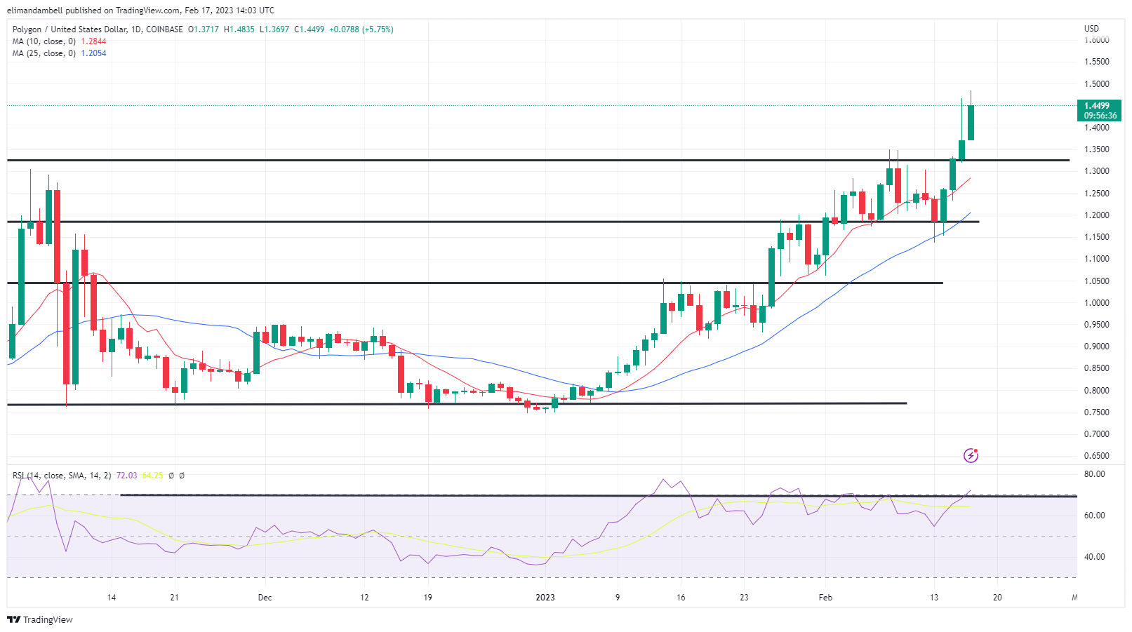 Following a low of $1.36 on Thursday, MATIC/USD rallied to an intraday high of $1.48 earlier in today’s session.
