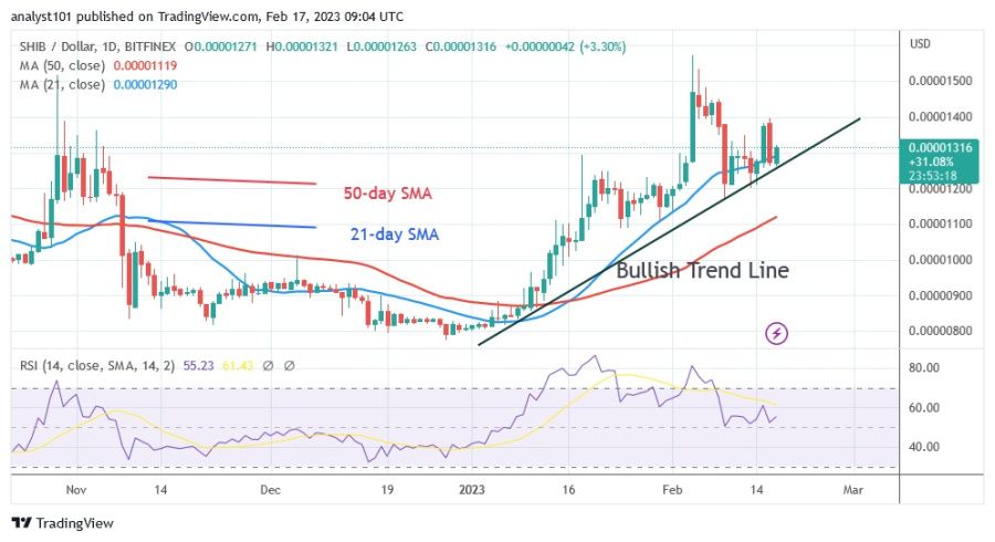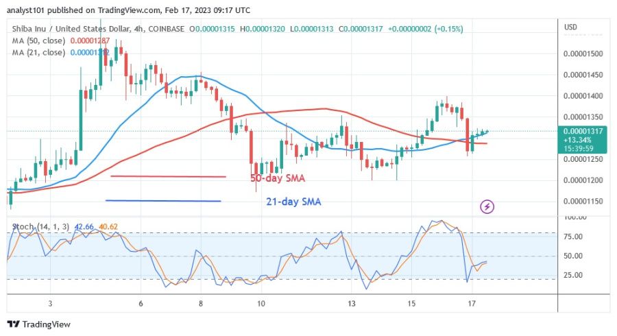 Since February 4, the current uptrend has been frozen at its high of $0.00001500. The SHIB price moved above the 21-day line SMA last week, but below the $0.00001500 resistance. If the price rises above the $0.00001500 resistance, the altcoin will start moving again. The price of SHIB will continue to rise and reach a high of $0.00001700. However, the sideways movement will continue below the resistance level if buyers are not able to keep the price above the $0.00001500 barrier. However, if the price falls below the 21-day line SMA, the uptrend could come to a halt. SHIB will either experience new selling pressure or get stuck in the moving average lines.