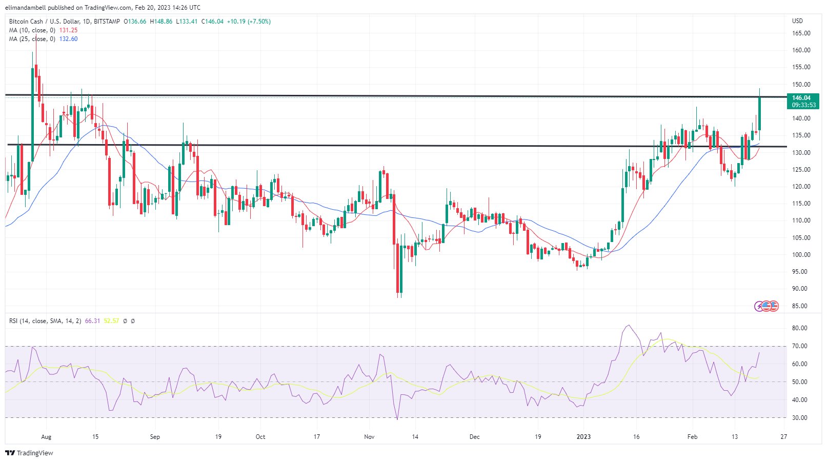 BCH/USD raced to a high of $146.83 earlier in the day, which comes after trading at a bottom of $134.55 on Sunday.
