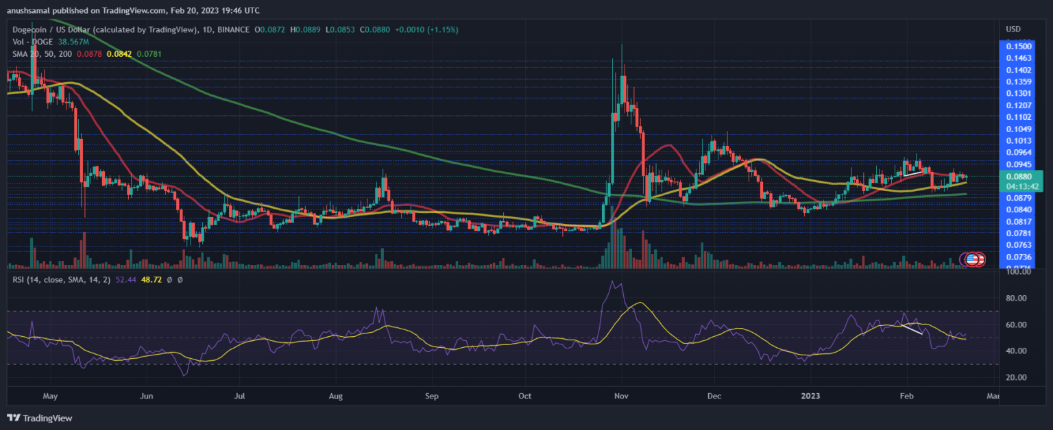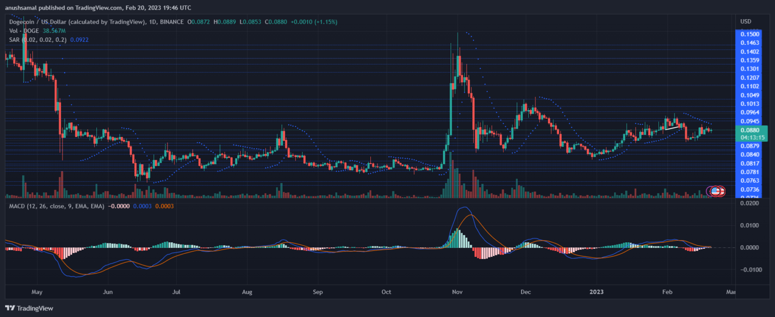 DOGE was circulating at $0.088 at the time of writing. In the past week, the coin breached the $0.080 resistance level. The level above acted as a crucial price ceiling for the coin. Immediate resistance for DOGE was at $0.090; breaching this level can make the coin rally to $0.10 and then to $0.11.