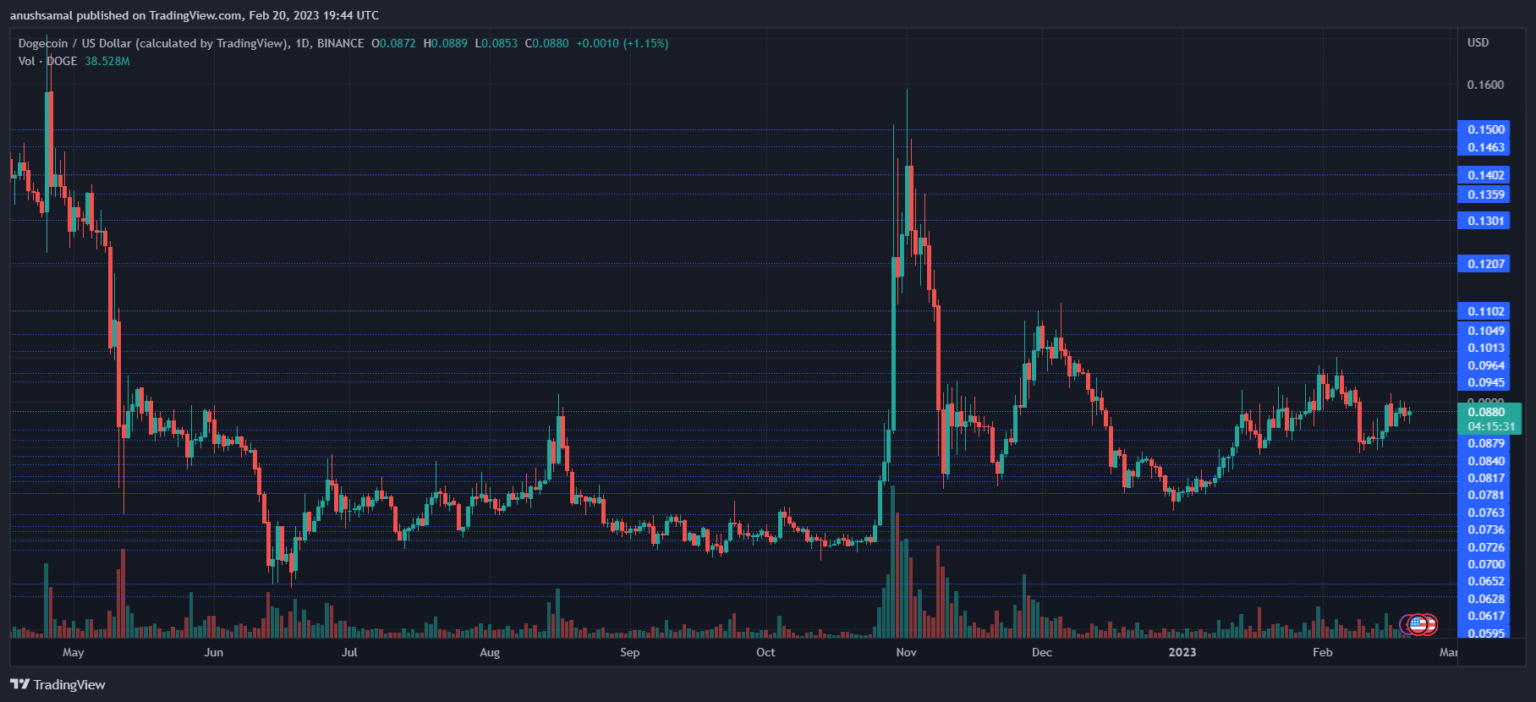 The Dogecoin price, like other tokens, has wobbled under its immediate price ceiling ever since Bitcoin lost the $25,000 level. Over the last 24 hours, DOGE fell by 1.1%, indicating sideways trading on the daily chart. In the past week, the meme coin rallied close to 8%.