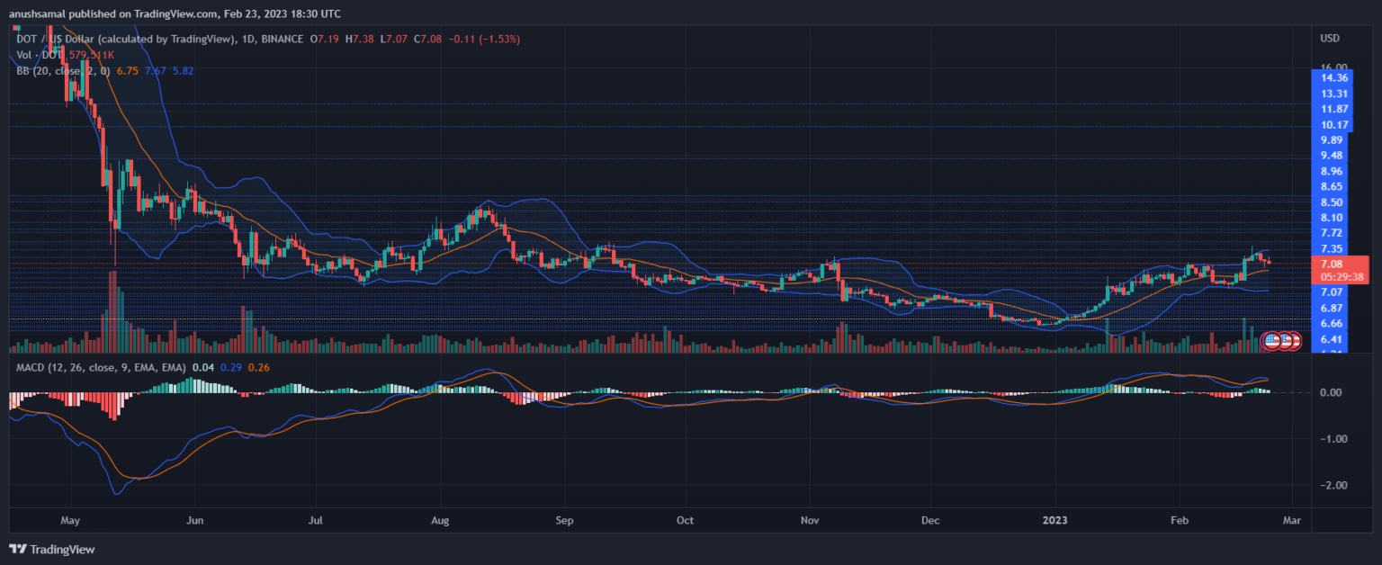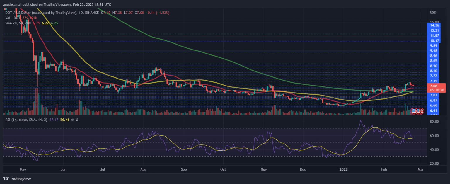 $DOT was trading at $7.08 at the time of writing. The altcoin price was trading very close to its immediate resistance mark. For the bulls to take control, $DOT must rise above $7.20 in the next trading session, or the coin will fall in value.