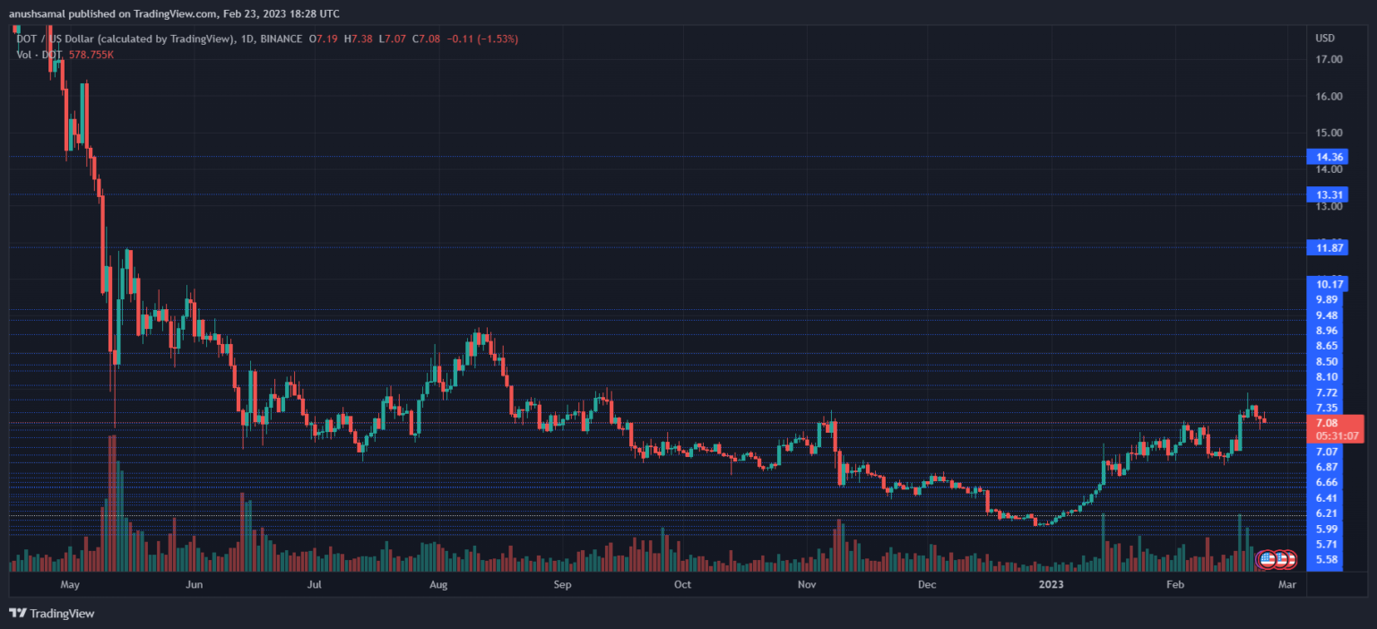 The Polkadot price is trading 88% below its all-time high, secured in 2021. The bulls can soon take over if $DOT breaks past its immediate price ceiling. On the other hand, if demand retreats further, the bears might gain complete control over the price.