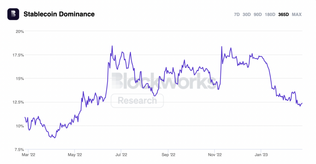 The metric, which tracks how much of crypto’s total market value is stablecoins, has dropped 12.37%, its lowest point since May 2022, per Blockworks Research.