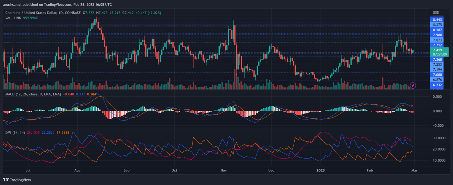 The Chainlink price has moved above the $7 mark, below which LINK had traded for multiple weeks. Over the last week, LINK lost close to 8% of its value. On the daily chart, the altcoin was consolidating with a loss of 0.4%.