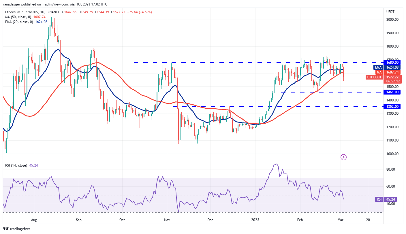 Ether (ETH) once again turned down from the overhead resistance of $1,680 on March 2, indicating that bears are defending the level with vigor.