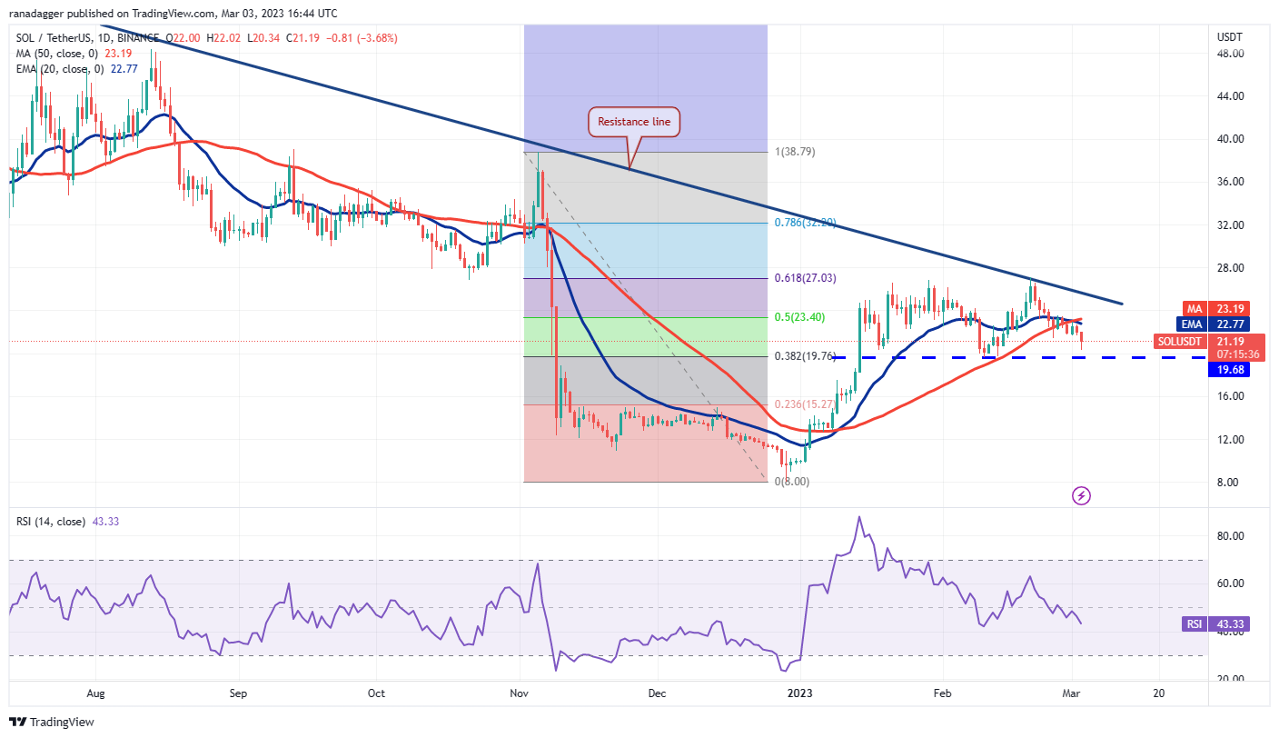 The bulls once again failed to push Solana (SOL) above the 20-day EMA ($22.77) on March 1. That attracted further selling and pulled the price near $19.68.