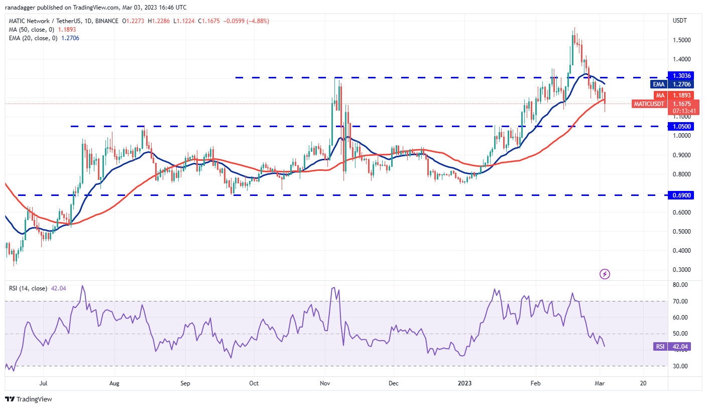 The selling picked up momentum on March 3 and the bears sent the price tumbling below the 50-day SMA. If the price sustains below the 50-day SMA, the MATIC/USDT pair could slide to the strong support at $1.05.