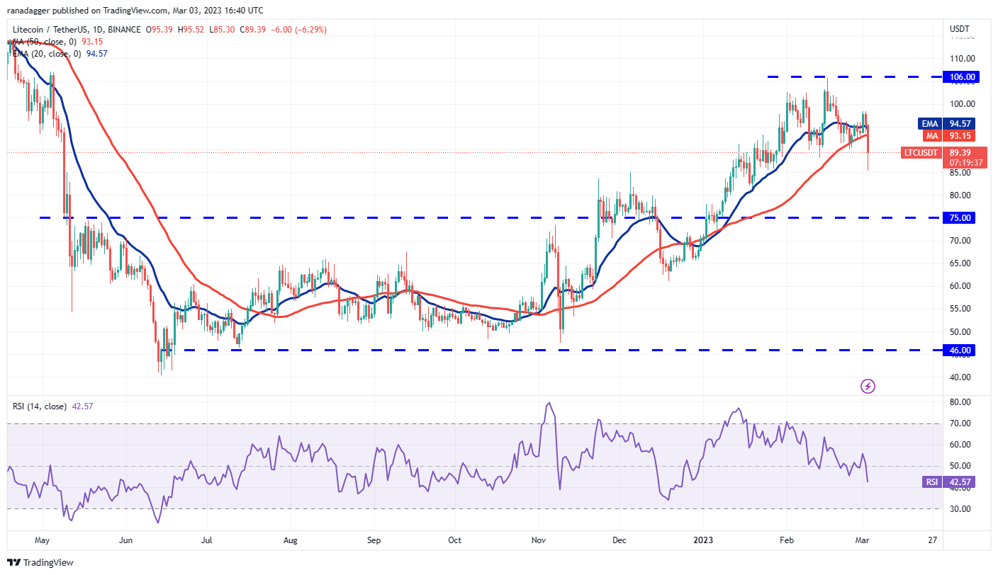 Litecoin (LTC) bounced off the 50-day SMA ($93) on Feb. 28 and soared above the 20-day EMA ($94) on March 1. However, the bulls could not sustain the higher levels.