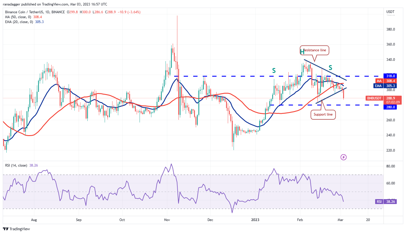 The symmetrical triangle pattern in BNB (BNB) resolved to the downside on March 3, indicating that the bears overpowered the bulls.