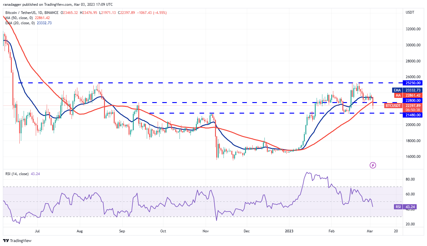 The failure to rise above the $24,000 level may have tempted traders to book profits. The selling accelerated on March 3 and the bears pulled the price below the immediate support at $22,800.