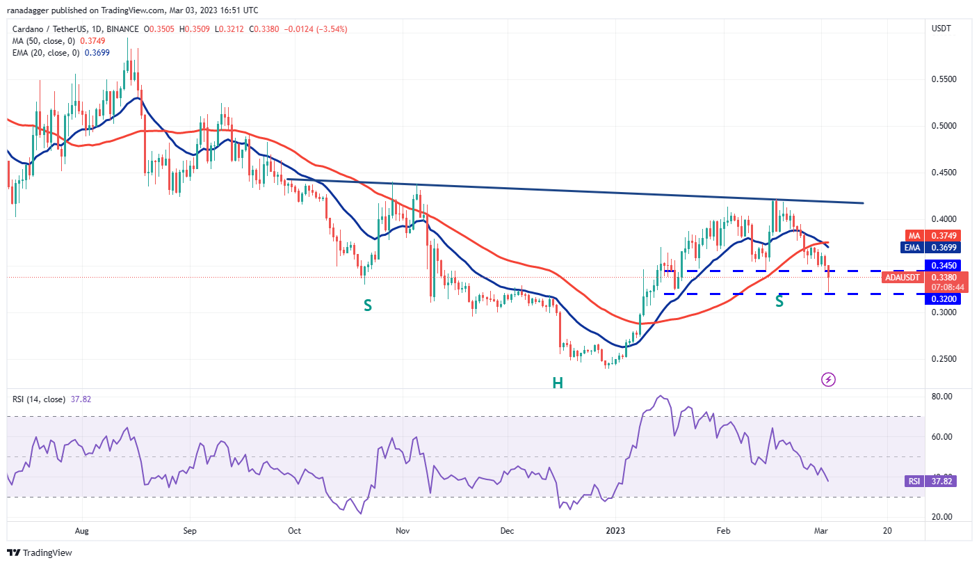 Cardano (ADA) tried to rebound off $0.34 on March 1 but the bears sold at higher levels and yanked the price below the support on March 3.