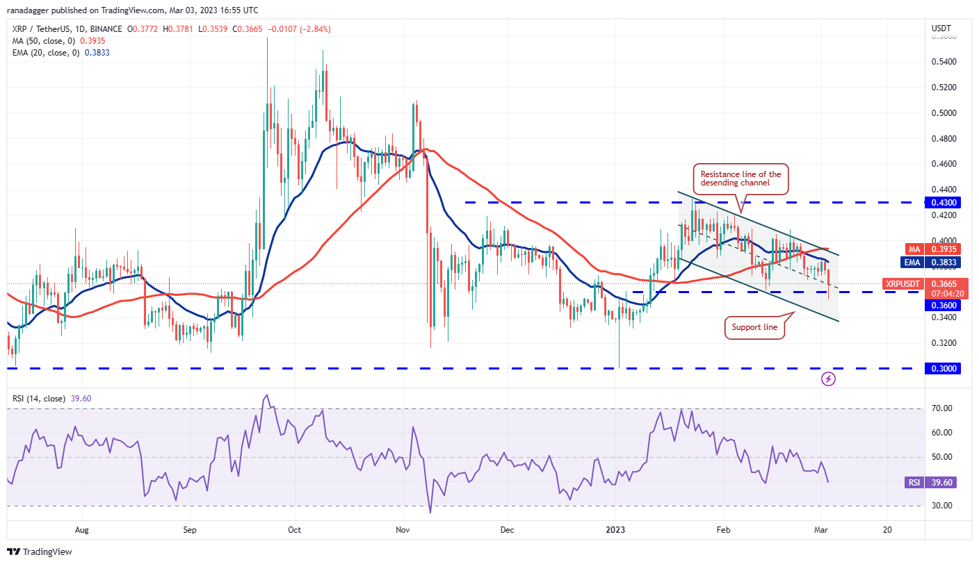 The bulls pushed XRP (XRP) to the 20-day EMA ($0.38) on March 1 but could not clear the overhead barrier. This suggests that the sentiment remains negative and traders are selling on rallies.