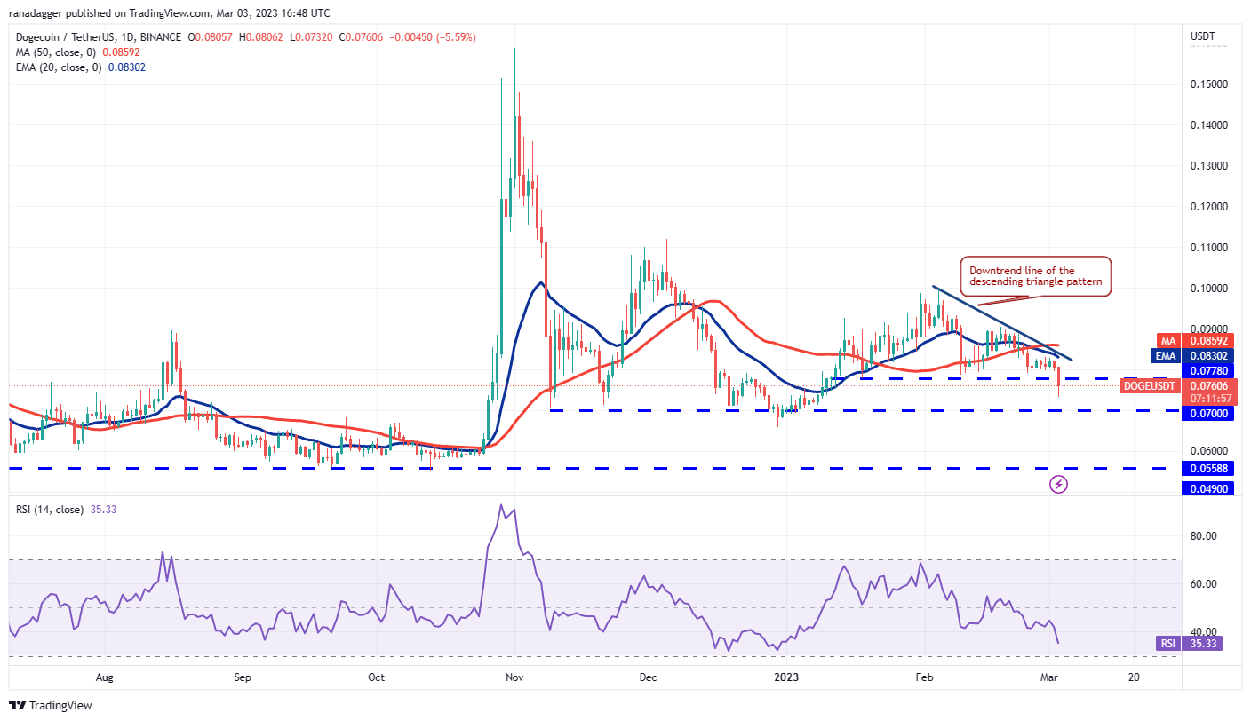 Dogecoin (DOGE) plunged below the $0.08 support on March 3, which completed the bearish descending triangle pattern.
