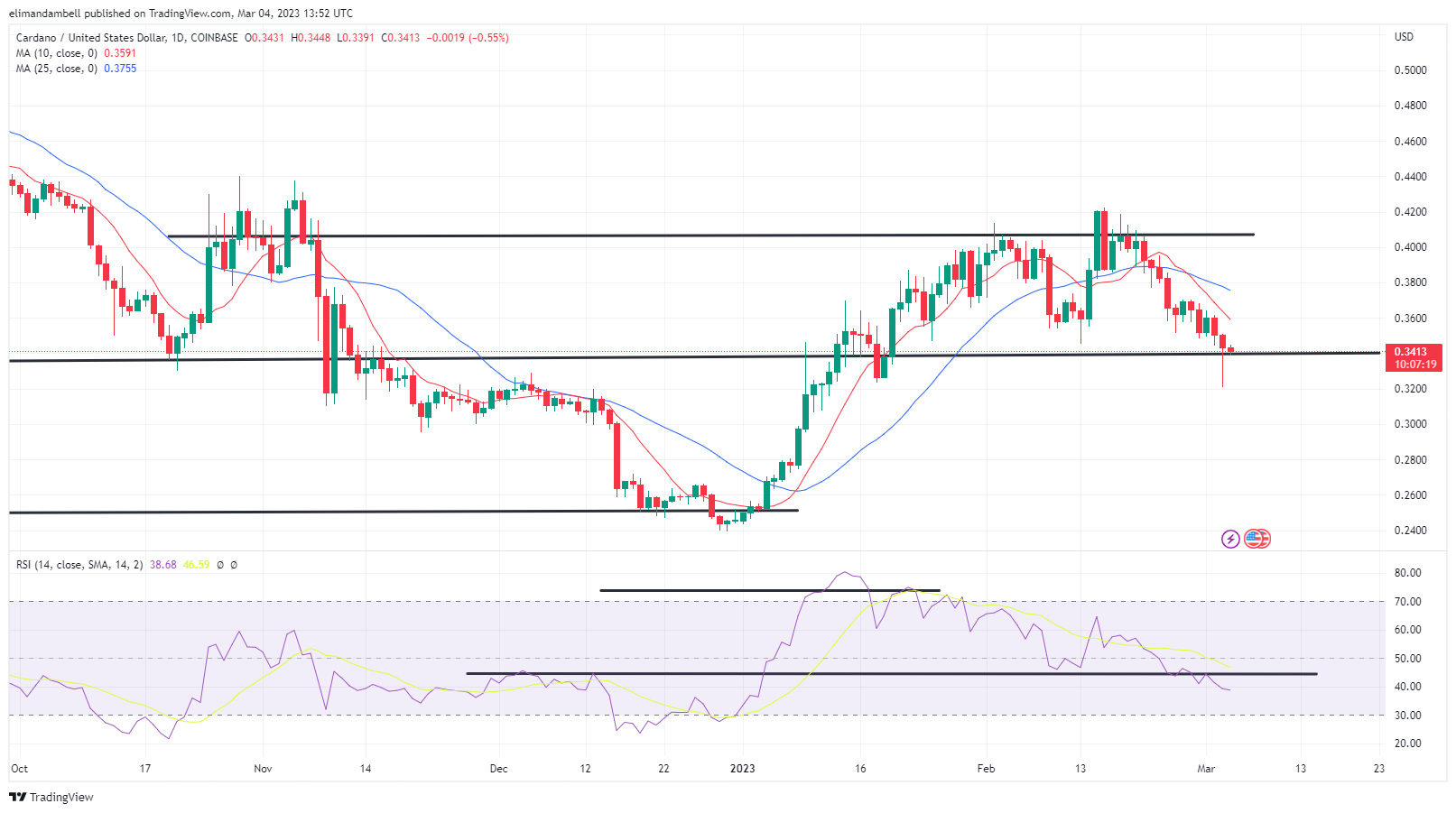 Cardano is now trading at $0.3418, which is higher than the aforementioned floor at $0.3400.