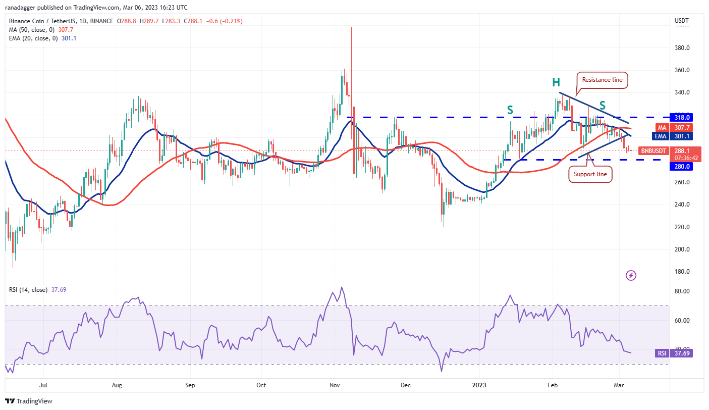 If bears sink the price below $280, the BNB/USDT pair will complete a bearish head and shoulders (H&S) pattern. That could start a downward move toward the first target at $245 and thereafter $222.