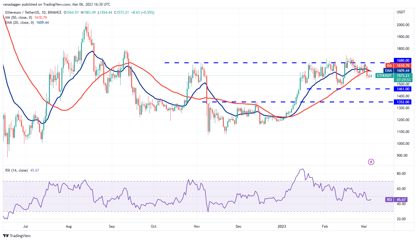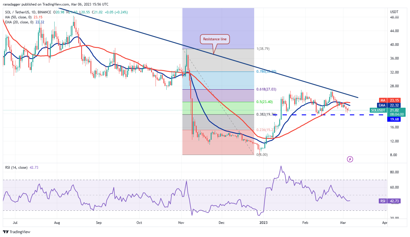 The bulls tried to start a recovery in Solana (SOL) on March 5 but the long wick on the day’s candlestick shows selling near the 20-day EMA ($22.32).
