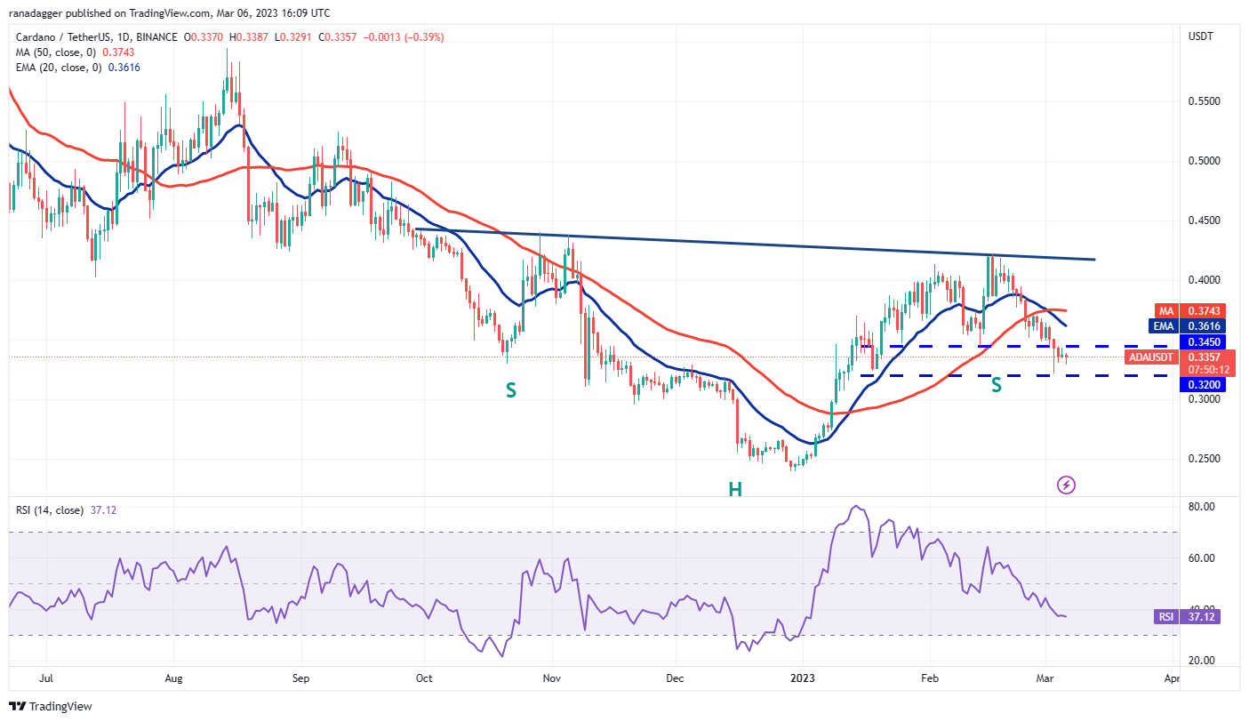 XRP’s (XRP) rebound off the $0.36 support on March 3 met with strong selling near the 20-day EMA ($0.38). This suggests that the sentiment is negative and traders are selling on rallies.