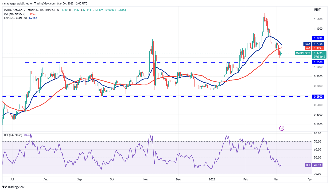 The downsloping 20-day EMA ($1.23) and the RSI below 41 suggest advantage to the bears. The MATIC/USDT pair could drop to the solid support at $1.05. Buyers are expected to defend this level aggressively because a break and close below it may sink the pair to $0.90 and thereafter to $0.69.