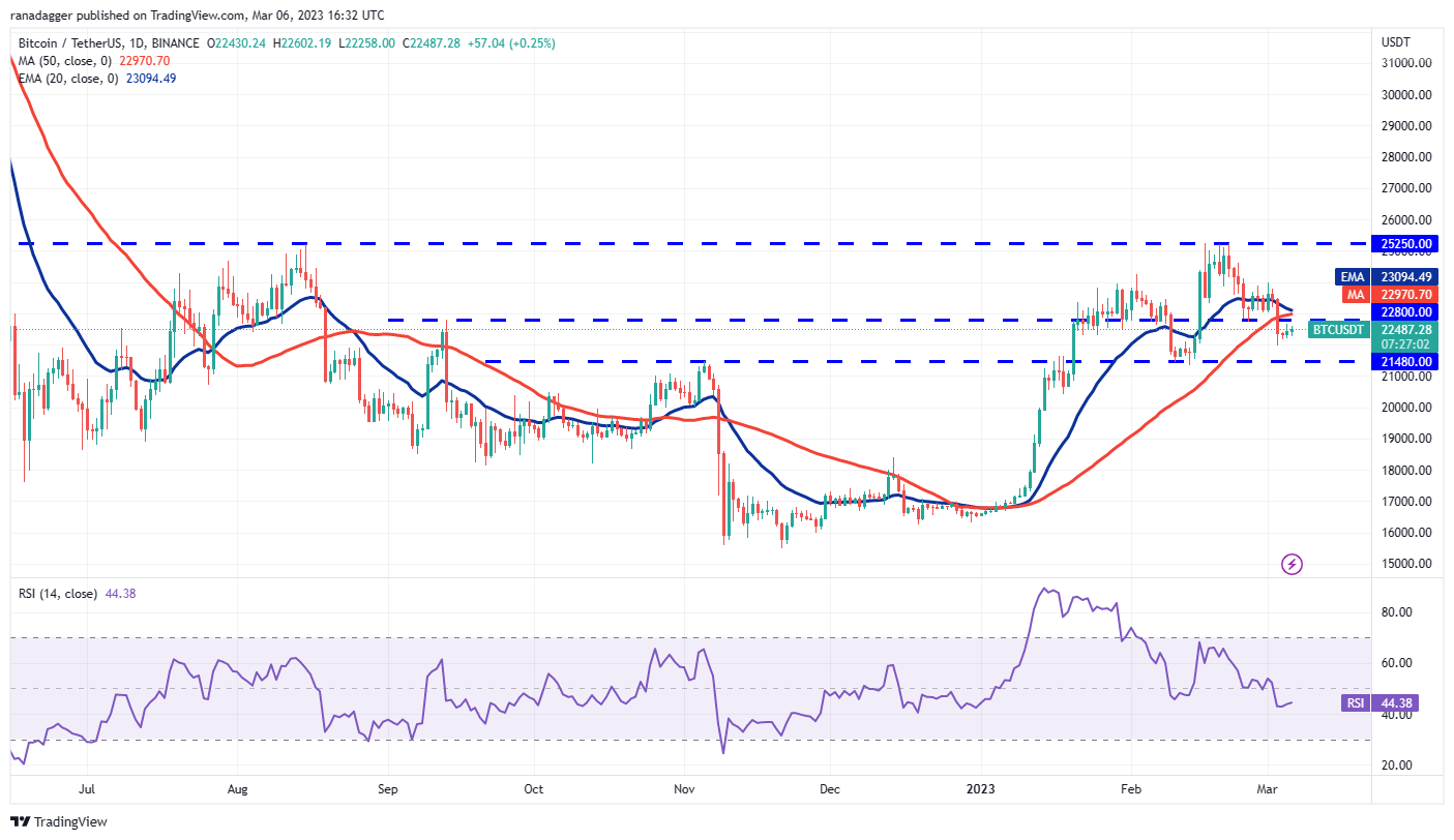 Bitcoin is struggling to climb back above $22,800, indicating that the bears are trying to flip the level into resistance. The moving averages are about to complete a bearish crossover and the relative strength index (RSI) is in the negative zone, signaling advantage to the bears.