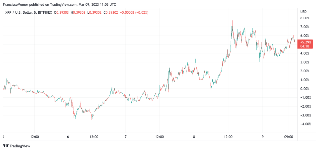The price of $XRP, the native token of the XRP Ledger, has been bucking a bearish trend in the wider cryptocurrency sector that has seen the price of major cryptocurrencies, including Bitcoin and Ethereum, drop amid the collapse of Silvergate Bank, a major financial institution focused on the crypto space.